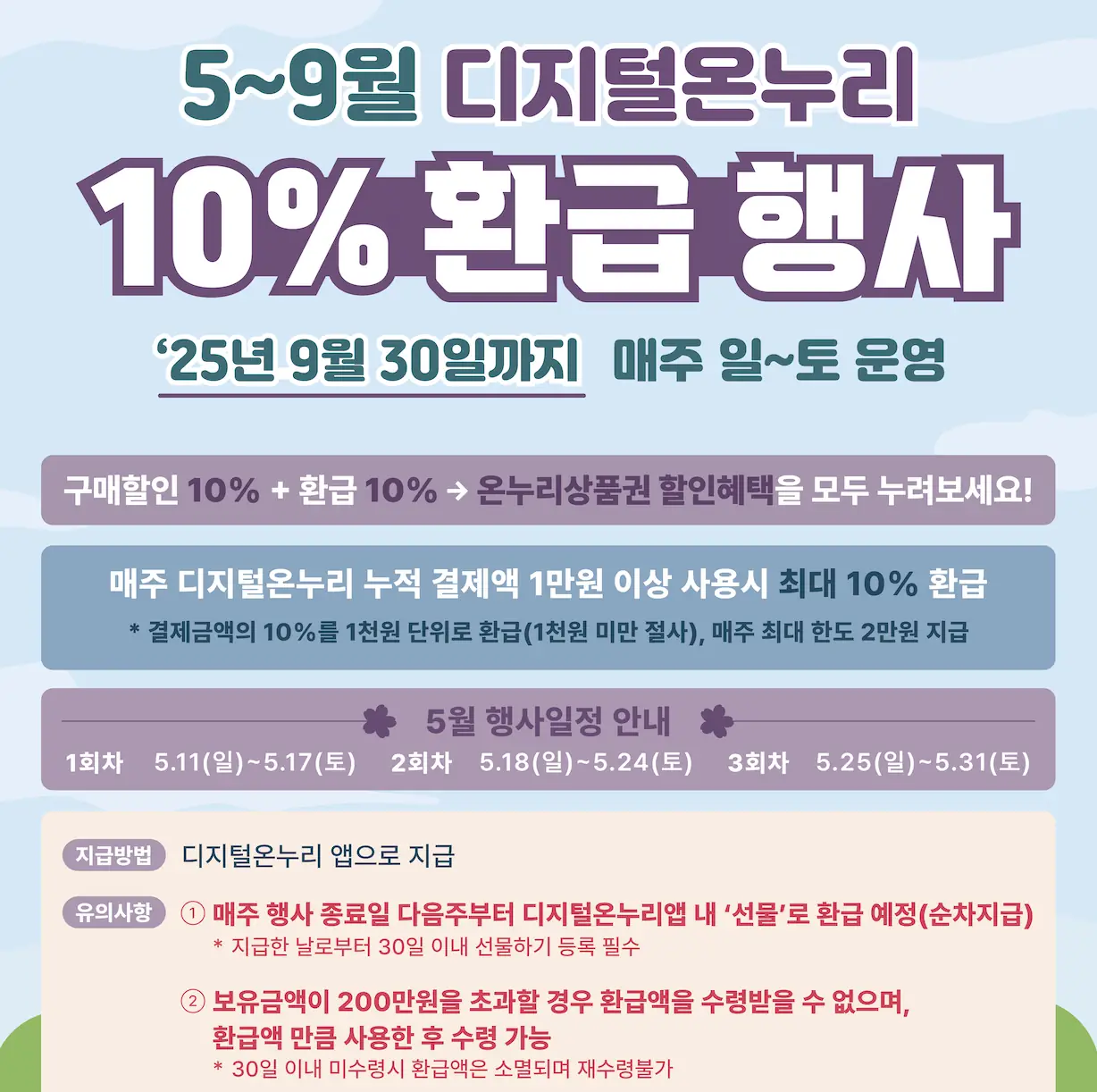 - 디지털 온누리상품권 5개월간 10% 캐시백: 5월 11일∼9월 30일, 일요일∼토요일 한 주를 1회차로 묶어 결제액의 10%를 추가 환급. 회차별 최대 2만 원, 총 20회차.