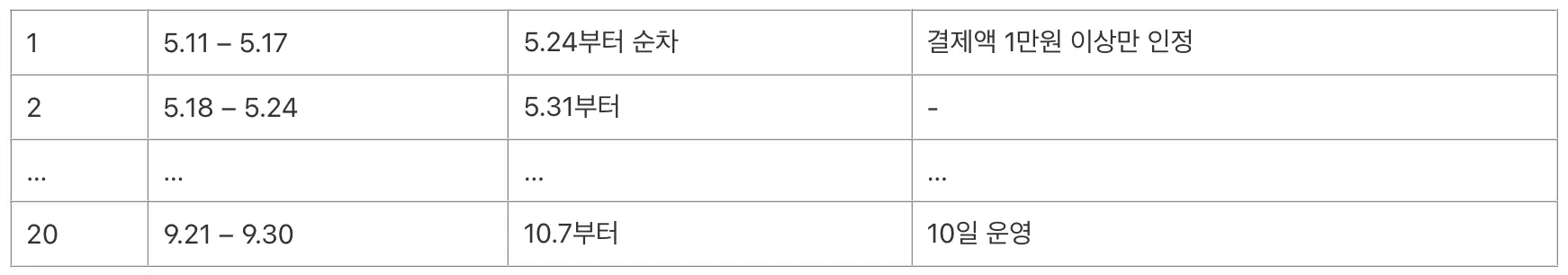 | 1 | 5.11 – 5.17 | 5.24부터 순차 | 결제액 1만원 이상만 인정 |